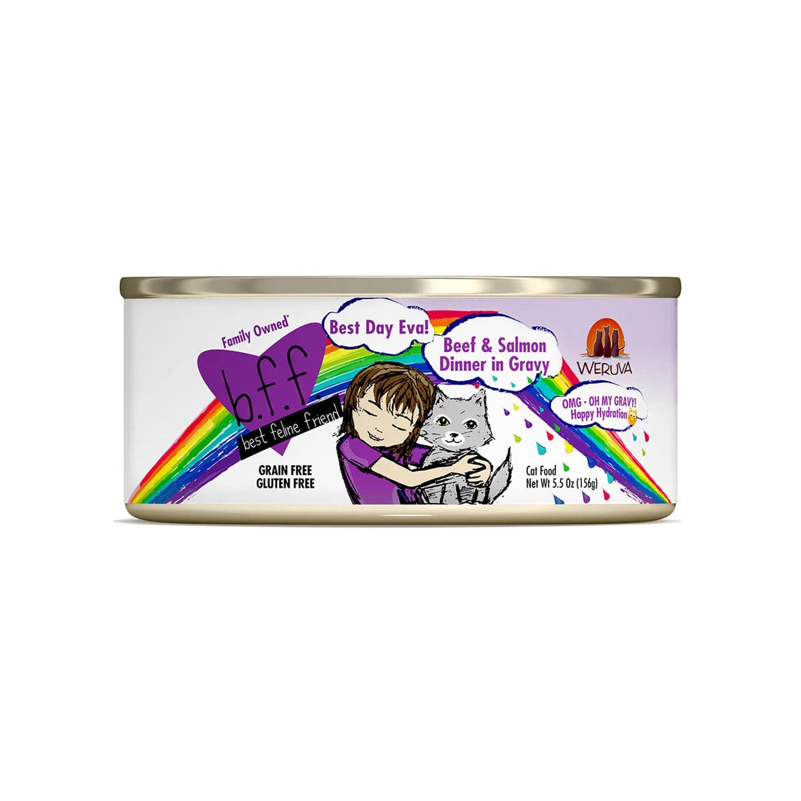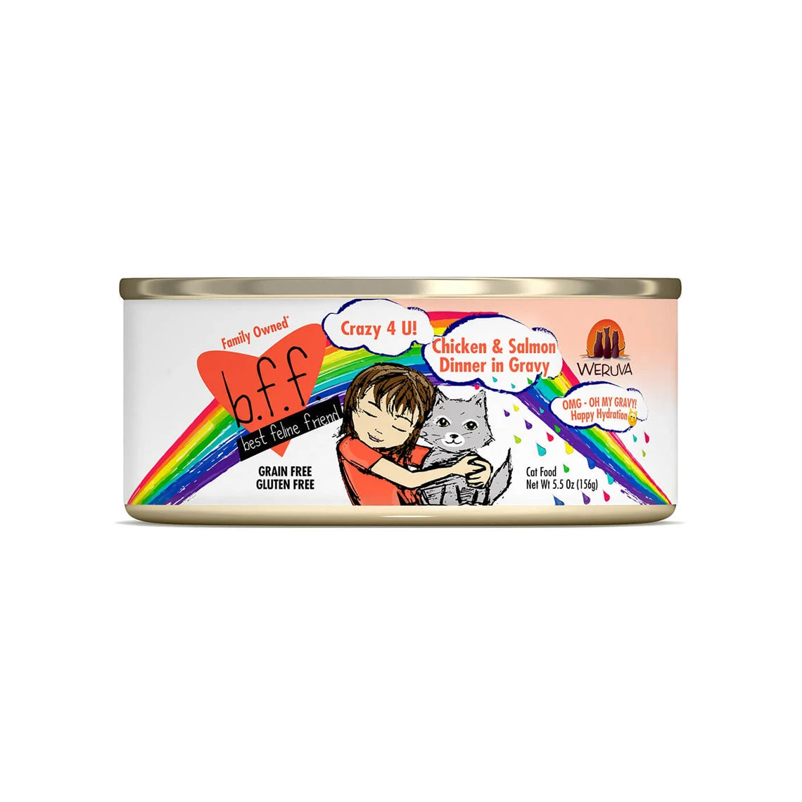 Each can of BFF gravy cat food contains different flavors and protein mixes, from chicken and turkey, chicken and salmon, chicken and lamb, duck and tuna, to beef and salmon. All flavors topped with delicious gravy to create the best wet cat food with gravy for your favorite feline. Available in a 2.8 oz or 5.5oz can, in singles or in cases.
