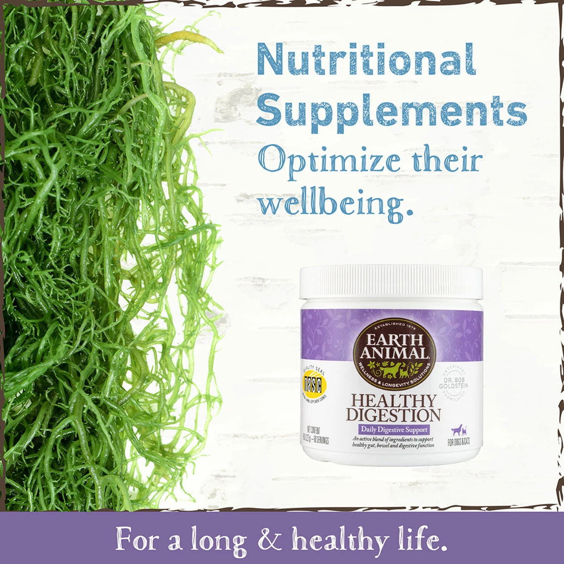 Earth Animal Healthy Digestion Nutritional Supplement Powder for Cats & Dogs supports proper digestion and bowel health. Helps maintain healthy gut flora and pH, and it supports normal digestive function.