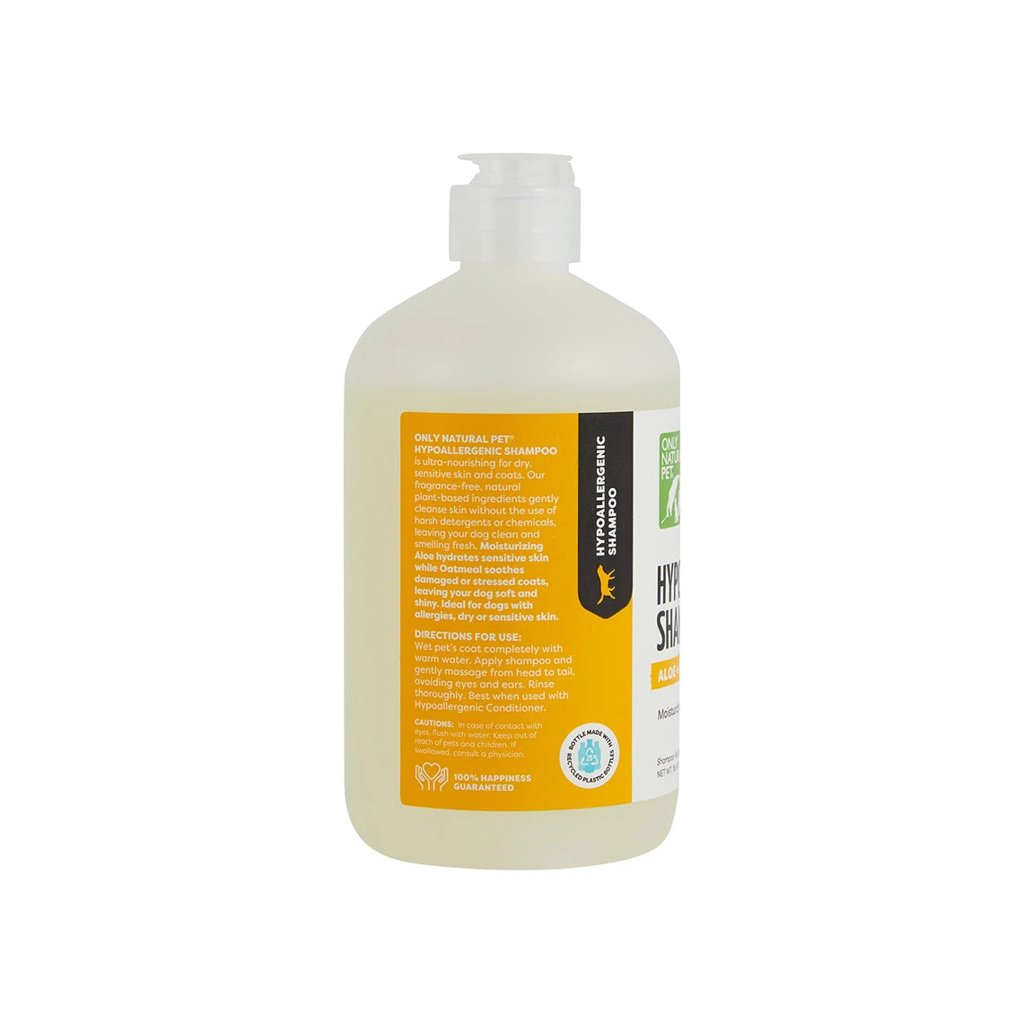 Only Natural Pet Hypoallergenic Shampoo for Dogs is ultra-nourishing for dry, sensitive skin and coats. The fragrance-free, natural plant-based ingredients gently cleanse skin without the use of harsh detergents or chemicals, leaving your dog clean and smelling fresh. Moisturizing Aloe hydrates sensitive skin while Oatmeal soothes damaged or stressed coats, leaving your dog soft and shiny. Ideal for dogs with allergies, dry or sensitive skin.