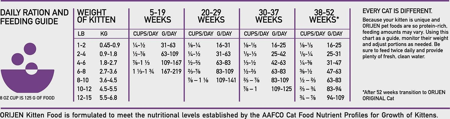 Orijen Whole Prey Chicken, Turkey, Salmon & Herring Kitten Food is specially formulated to give your kitten the nutrients they need to grow healthy and strong. Your kitten will thrive when you feed them the fresh and raw animal protein they need.