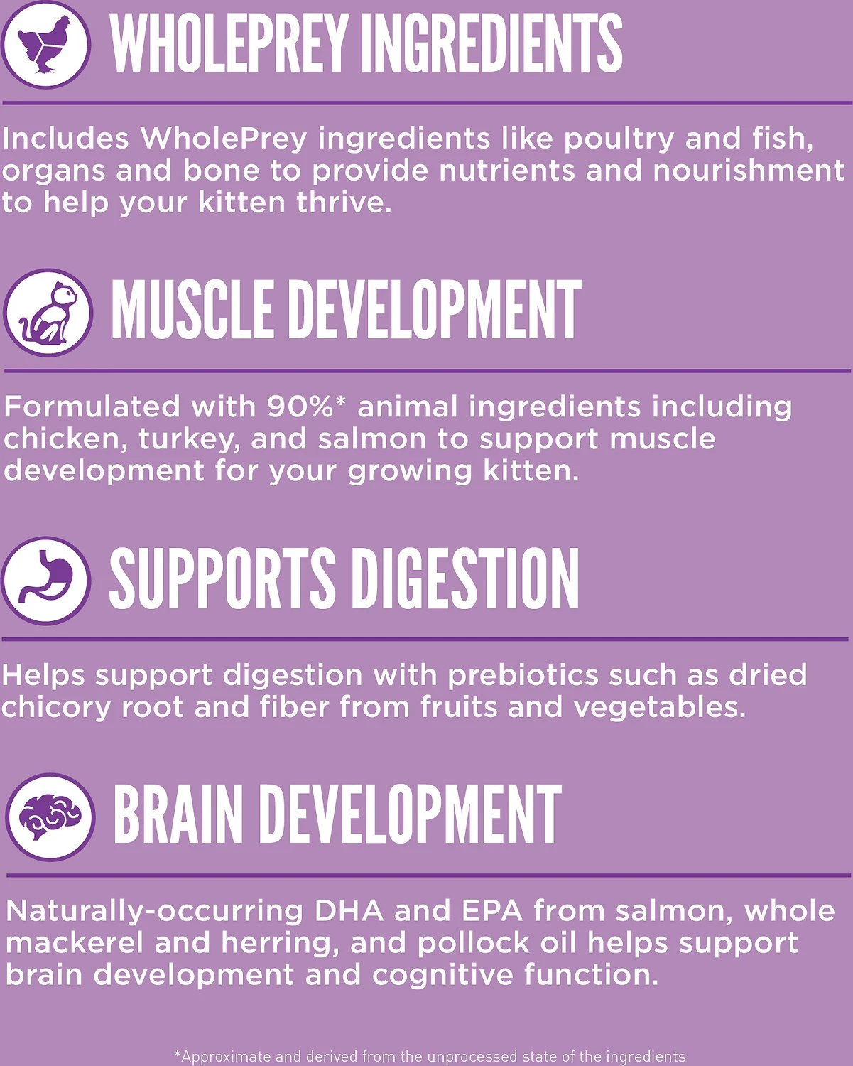 Packed with 90%* premium animal ingredients like chicken, turkey and salmon, it helps support muscle development in your growing kitten. Orijen Kitten Food also contains 15 fresh or raw ingredients, including WholePrey ingredients like muscle meat, organs and bone, the most succulent and nourishing parts of the prey. This diet helps support your kitten’s brain development and cognitive function with naturally occurring DHA and EPA from salmon, whole mackerel and herring, and pollock oil.