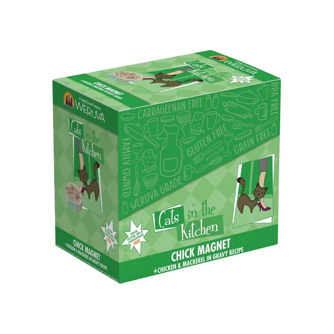 Weruva Chick Magnet Pouches feature free range Chicken in savory gravy. Completely grain and gluten free, this highly palatable formula features Vitamins B and K and is perfect for your obligate carnivore. These easy-to-open pouches seal in the food’s moisture, which is your cat’s primary source of hydration; they’re also BPA free. Open a pouch and let your cat enjoy Weruva Chick Magnet.